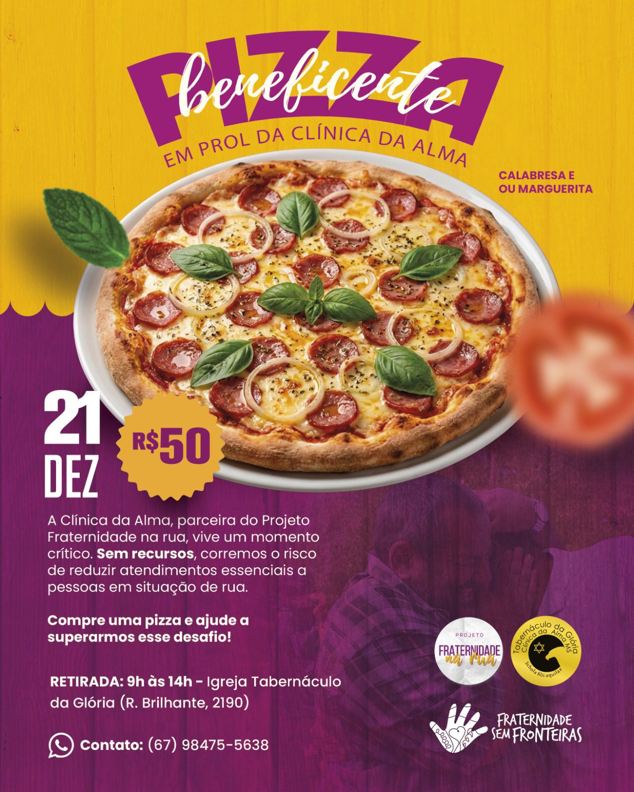 O Projeto Fraternidade na Rua – polo Campo Grande, funciona em parceria com a Clínica da Alma – que acolhe pessoas em situação de rua e oferece ajuda (baseada na disciplina, laborterapia e espiritualidade) para quem deseja vencer um dos maiores desafios sociais: a dependência química.
